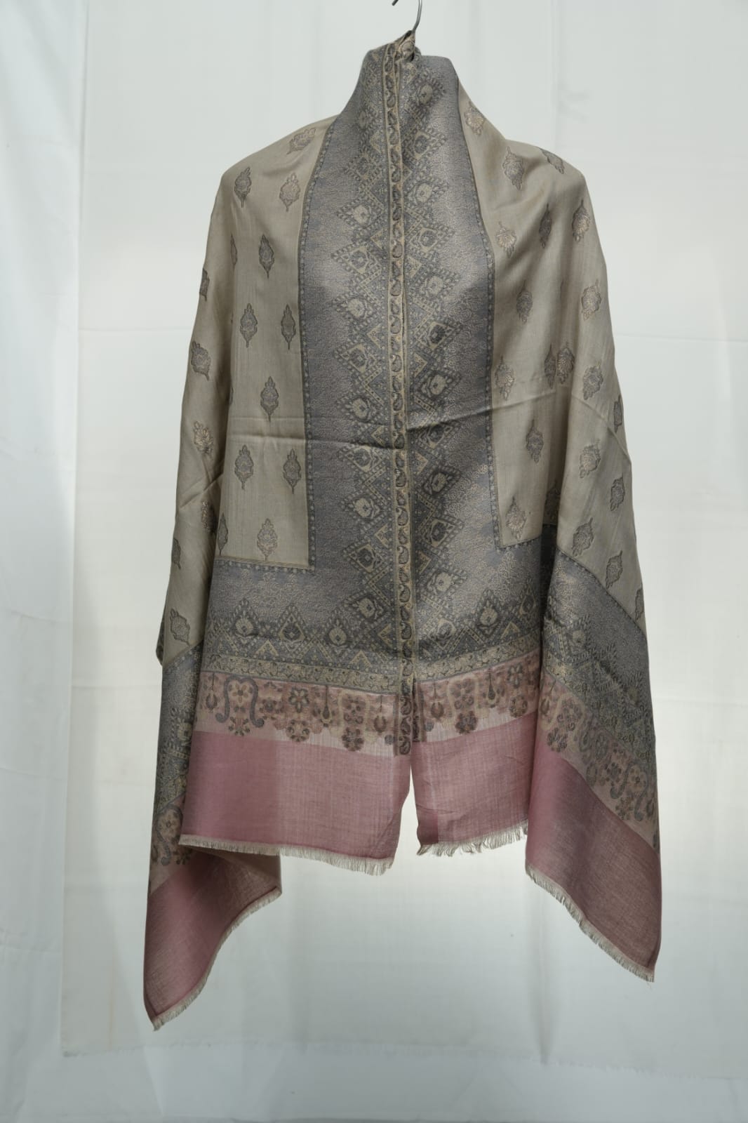 Kani Jama do Patri pashmina shawl with gray shade and pink bottom multi design